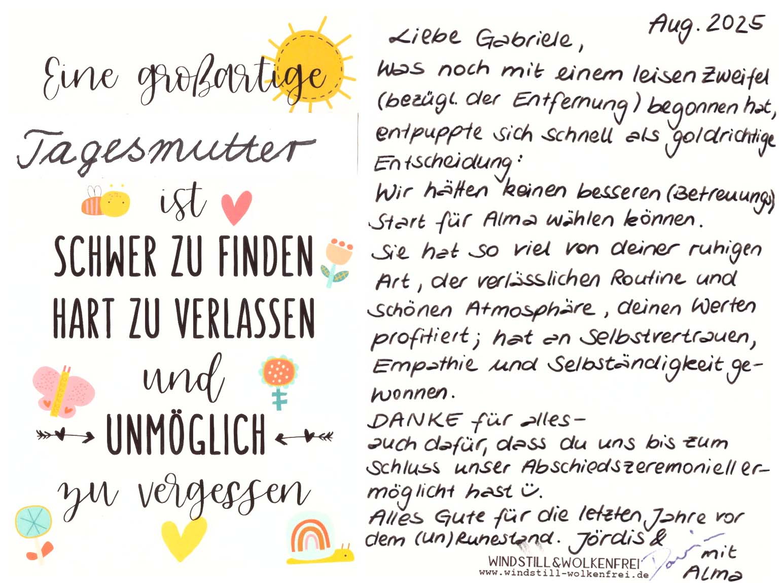 Wir durften unsere Kinder voller Vertrauen in deine Hände geben. Du hast sie behütet, gepflegt und genährt mit deinem Herzen, deinen offenen Armen, deiner Geduld und mit deinen klaren Worten.